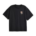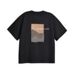 Black cotton tee featuring minimal abstract artwork at the center front, combining embroidery and print for a textured finish. 100% Cotton